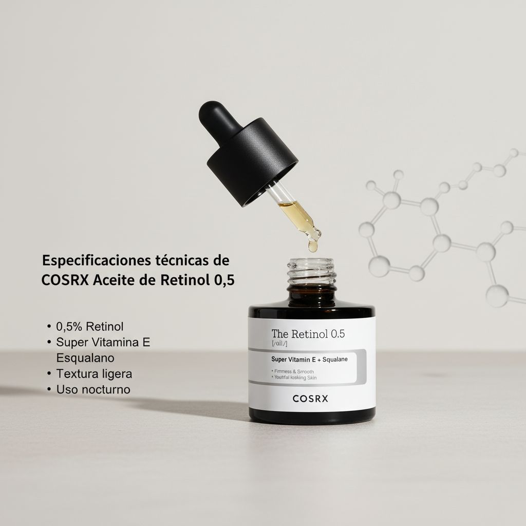 En términos de formulación, un producto identificado como COSRX Aceite de Retinol 0,5 se encuadra en la lógica de los retinoides: activos que suelen requerir una estrategia de tolerancia (introducción gradual, control de combinaciones y soporte de hidratación). En este contexto, el vehículo tipo aceite puede influir en la forma de aplicación (deslizamiento, extensión y sensación final), aunque la textura exacta no se puede determinar sin ficha técnica detallada.